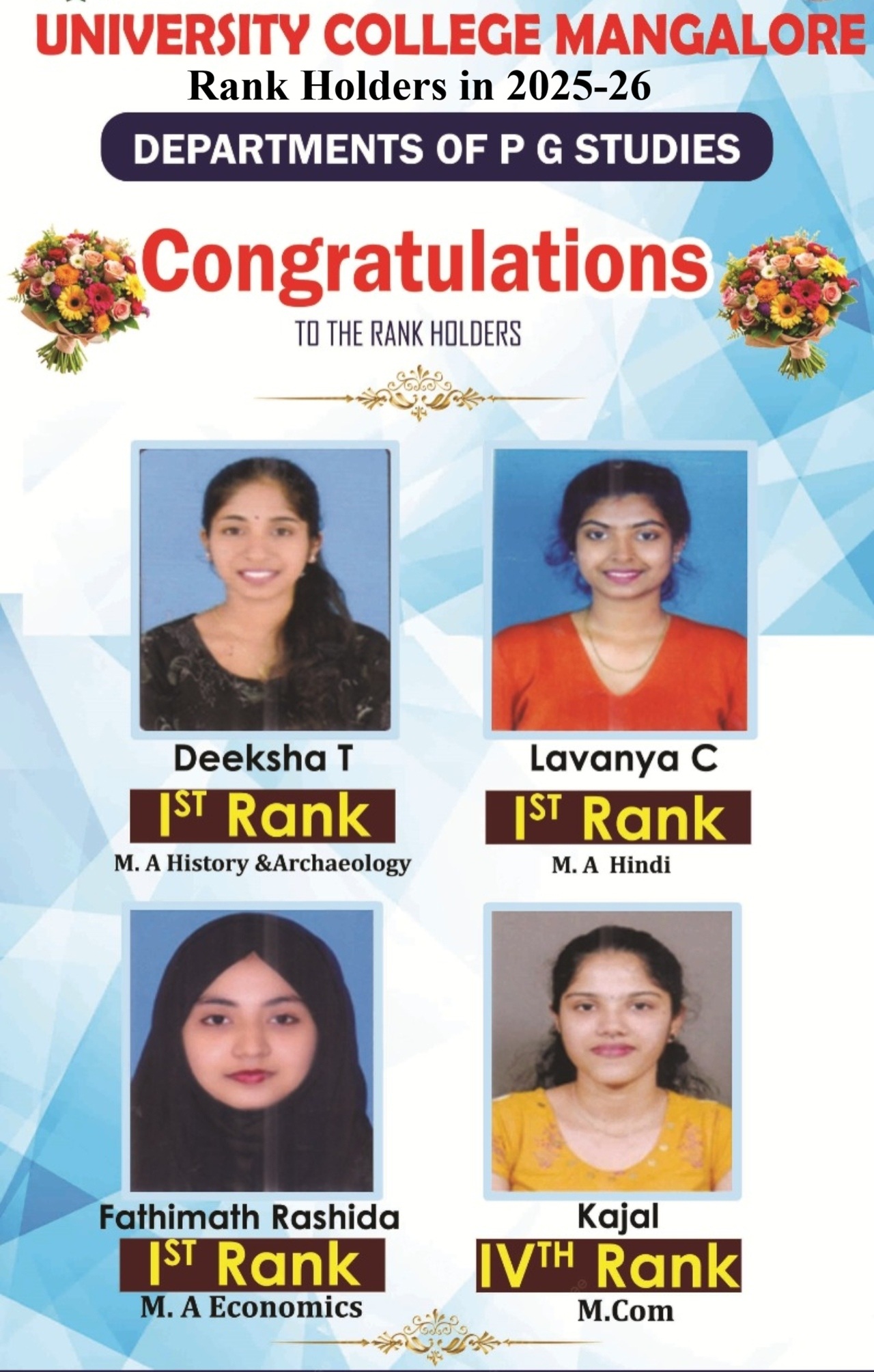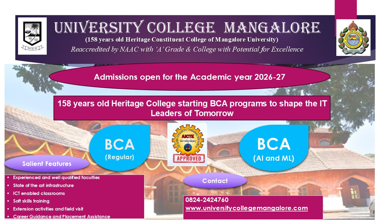 ucmangalore1@gmail.com University College, Mangalore, formerly known as Government College from glorious past is marching ahead towards a bright future. “To be the centre for knowledge to all sections of the society” is the guiding spirit of this institution.