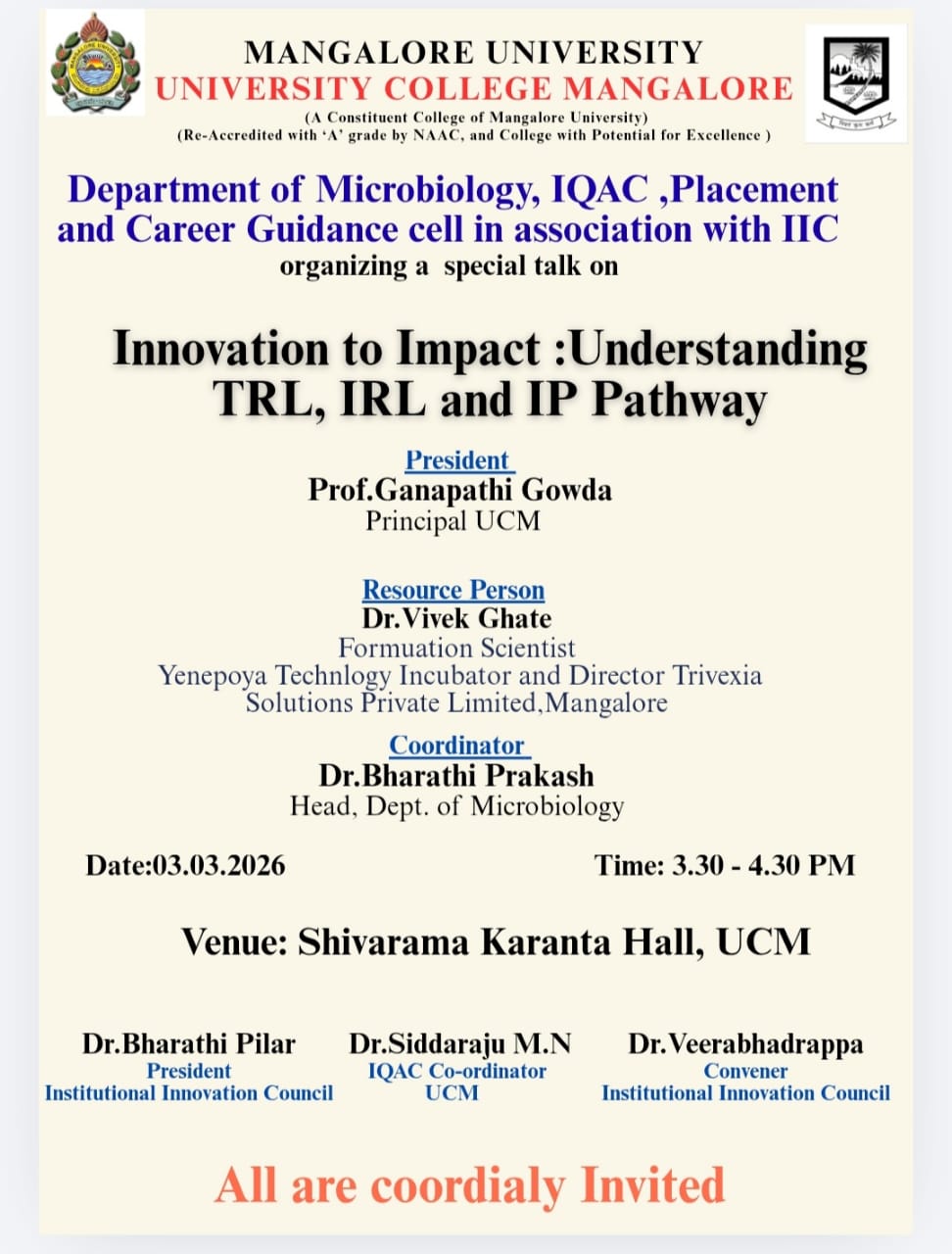 A special talk on ” Innovation to Impact: Understanding TRL, IRL and IP Pathway” held on 3rd March 2026